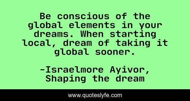 This page presents the quote "Be conscious of the global elements in your dreams. When starting local, dream of taking it global sooner.". Author of this quote is Israelmore Ayivor, Shaping the dream. This quote is about food-for-thought, elements, dream-big, consciousness, conscious, big-dreams, globe, global, local,.