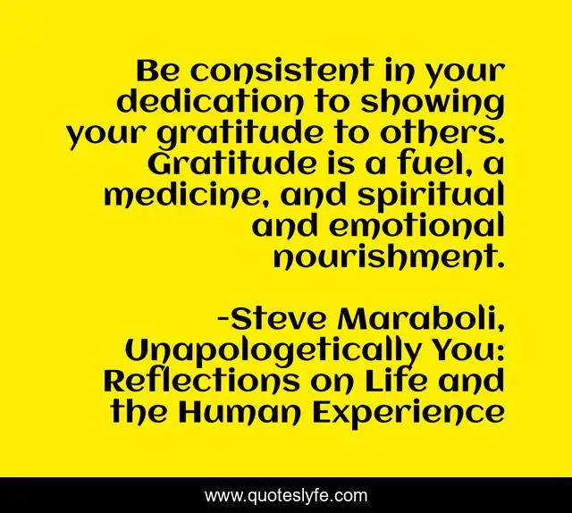 This page presents the quote "Be consistent in your dedication to showing your gratitude to others. Gratitude is a fuel, a medicine, and spiritual and emotional nourishment.". Author of this quote is Steve Maraboli, Unapologetically You: Reflections on Life and the Human Experience. This quote is about gratitude, medicine, life, nourishment, happiness,.