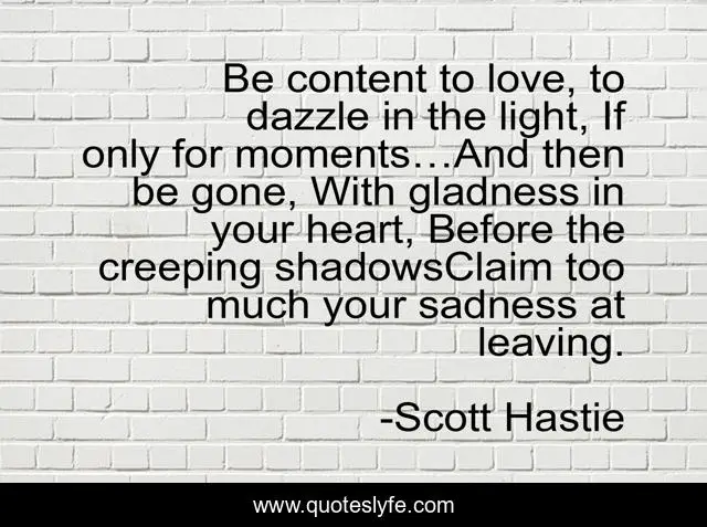 This page presents the quote "Be content to love, to dazzle in the light, If only for moments…And then be gone, With gladness in your heart, Before the creeping shadowsClaim too much your sadness at leaving.". Author of this quote is Scott Hastie. This quote is about gone, love, heart, moments, poetry, leaving, romance, moment, shadow,.