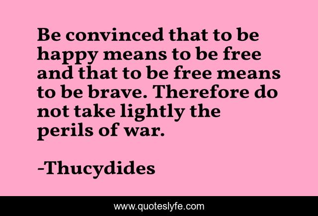 This page presents the quote "Be convinced that to be happy means to be free and that to be free means to be brave. Therefore do not take lightly the perils of war.". Author of this quote is Thucydides. This quote is about be happy, brave, happy,.