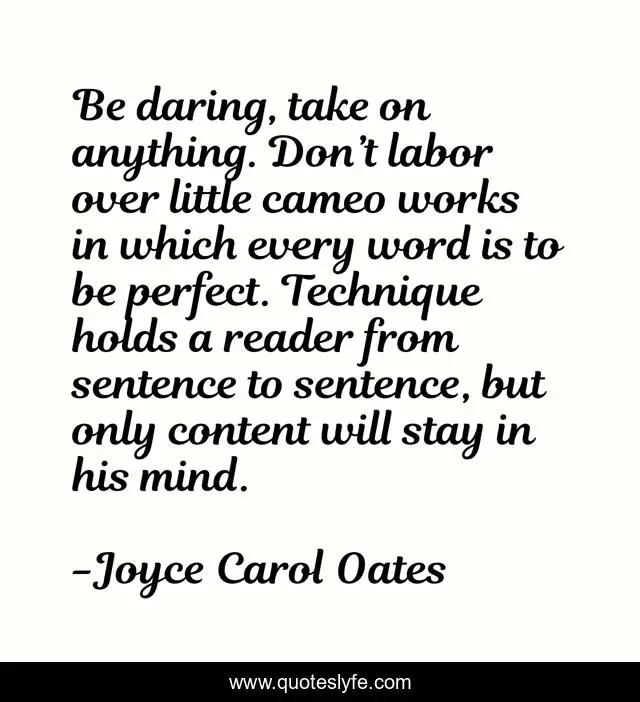 This page presents the quote "Be daring, take on anything. Don’t labor over little cameo works in which every word is to be perfect. Technique holds a reader from sentence to sentence, but only content will stay in his mind.". Author of this quote is Joyce Carol Oates. .