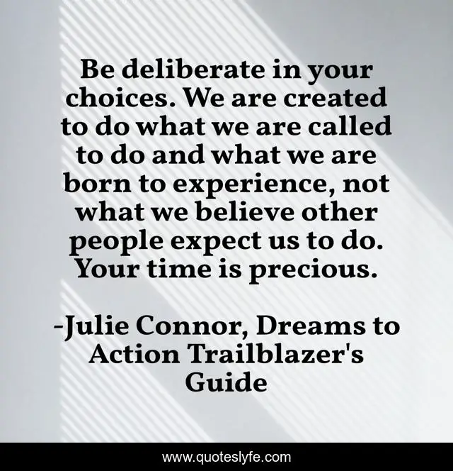 This page presents the quote "Be deliberate in your choices. We are created to do what we are called to do and what we are born to experience, not what we believe other people expect us to do. Your time is precious.". Author of this quote is Julie Connor, Dreams to Action Trailblazer's Guide. This quote is about confidence, believe, time-management, experience, choices, time, choice,.