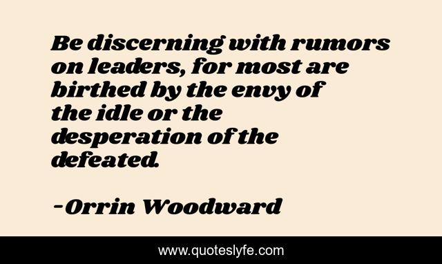 This page presents the quote "Be discerning with rumors on leaders, for most are birthed by the envy of the idle or the desperation of the defeated.". Author of this quote is Orrin Woodward. This quote is about gossip, envy, leadership, rumors, discernment,.