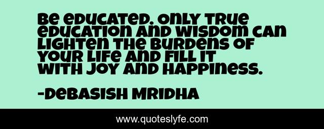 This page presents the quote "Be educated. Only true education and wisdom can lighten the burdens of your life and fill it with joy and happiness.". Author of this quote is Debasish Mridha. This quote is about joy, philosophy, debasish-mridha, inspirational, enthusiasm, education, happiness,.