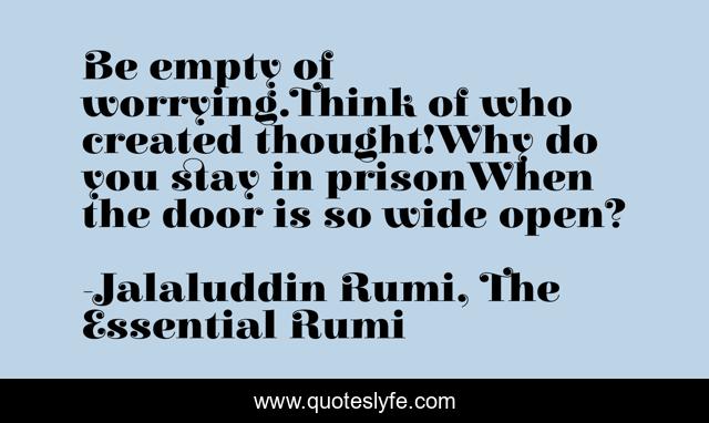 This page presents the quote "Be empty of worrying.Think of who created thought!Why do you stay in prisonWhen the door is so wide open?". Author of this quote is Jalaluddin Rumi, The Essential Rumi. This quote is about enthusiasm, inspirational,.