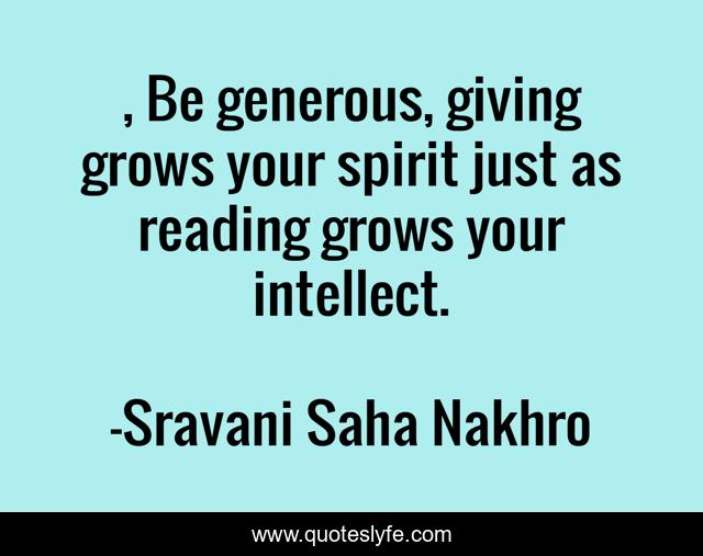 This page presents the quote ", Be generous, giving grows your spirit just as reading grows your intellect.". Author of this quote is Sravani Saha Nakhro. .