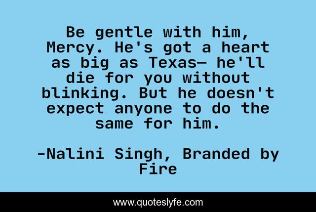 This page presents the quote "Be gentle with him, Mercy. He's got a heart as big as Texas— he'll die for you without blinking. But he doesn't expect anyone to do the same for him.". Author of this quote is Nalini Singh, Branded by Fire. This quote is about heart, andrew, riley, mercy,.