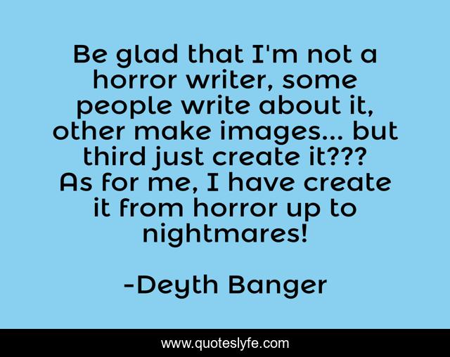 This page presents the quote "Be glad that I'm not a horror writer, some people write about it, other make images... but third just create it??? As for me, I have create it from horror up to nightmares!". Author of this quote is Deyth Banger. This quote is about horror, writers, writting, image, glad,.