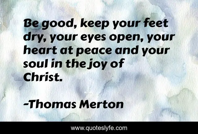 This page presents the quote "Be good, keep your feet dry, your eyes open, your heart at peace and your soul in the joy of Christ.". Author of this quote is Thomas Merton. This quote is about joy, eyes, good,.