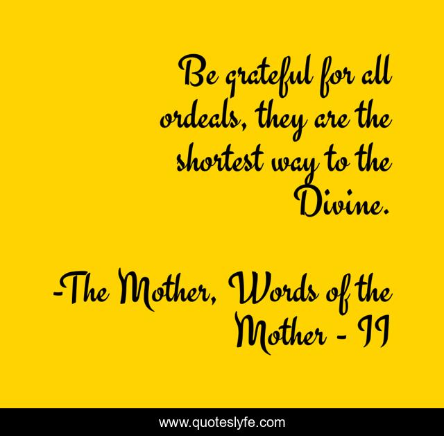 This page presents the quote "Be grateful for all ordeals, they are the shortest way to the Divine.". Author of this quote is The Mother, Words of the Mother - II. This quote is about gratitude, difficulties, divine, ordeals, shortest-path,.