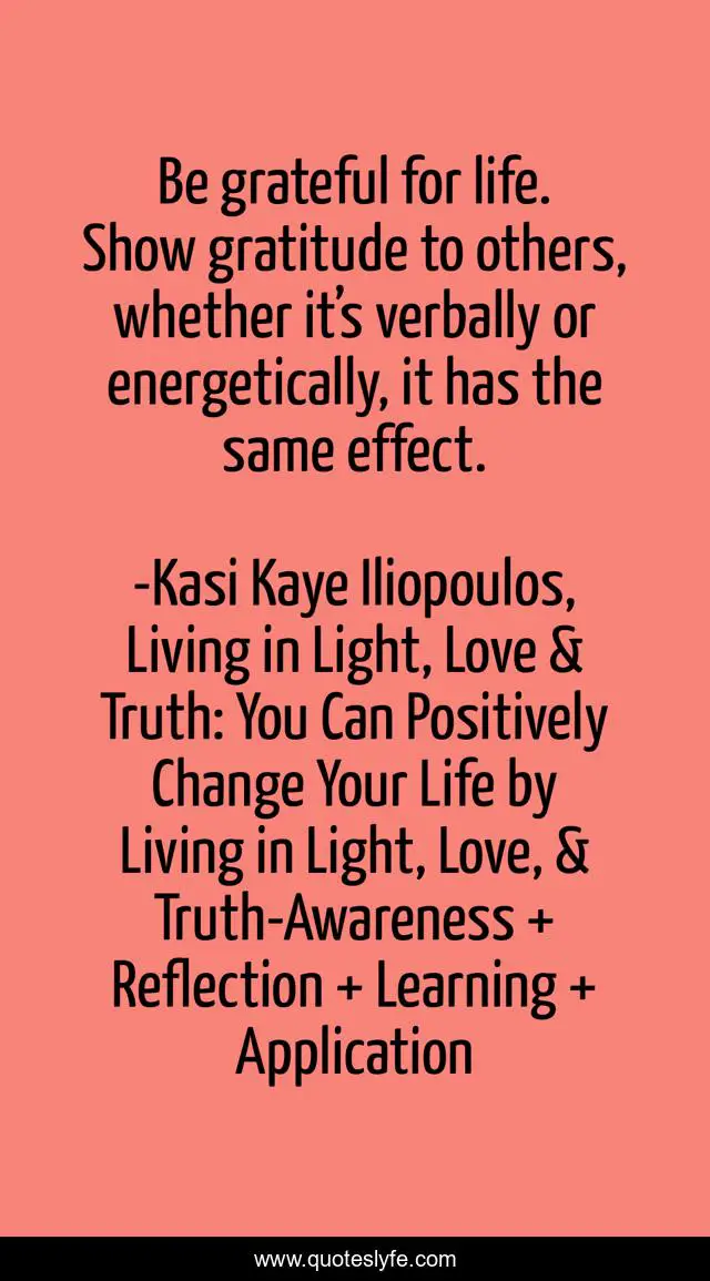 "Kasi Kaye Iliopoulos, Living in Light, Love & Truth: You Can Positively Change Your Life by Living in Light, Love, & Truth-Awareness + Reflection + Learning + Application Quotes." Quoteslyfe.com, 2025. Mon. 08 Dec. 2025. <https://www.quoteslyfe.com/quote/Be-grateful-for-life-Show-gratitude-to-116213>.