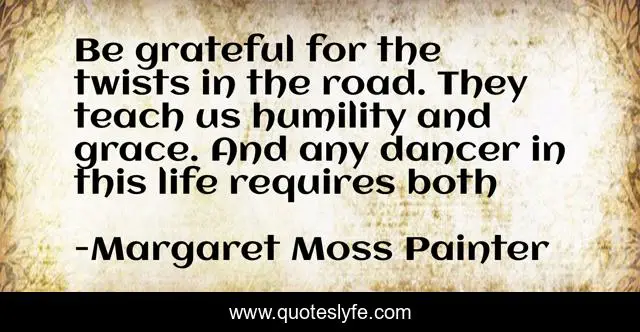 This page presents the quote "Be grateful for the twists in the road. They teach us humility and grace. And any dancer in this life requires both". Author of this quote is Margaret Moss Painter. This quote is about adversity, enthusiasm, grace, inspirational, humility,.