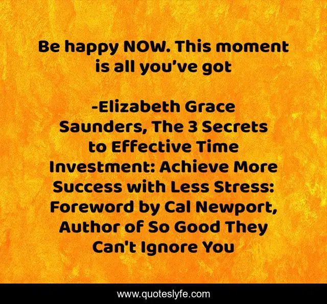 "Elizabeth Grace Saunders, The 3 Secrets to Effective Time Investment: Achieve More Success with Less Stress: Foreword by Cal Newport, Author of So Good They Can't Ignore You Quotes." Quoteslyfe.com, 2025. Mon. 08 Dec. 2025. <https://www.quoteslyfe.com/quote/Be-happy-NOW-This-moment-is-all-106706>.