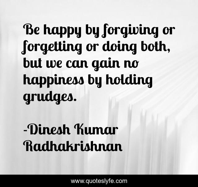This page presents the quote "Be happy by forgiving or forgetting or doing both, but we can gain no happiness by holding grudges.". Author of this quote is Dinesh Kumar Radhakrishnan. This quote is about forget, forgetting, grudges, forgiving, forgiveness, happiness,.