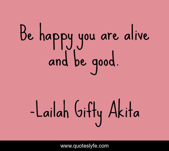 This page presents the quote "Be happy you are alive and be good.". Author of this quote is Lailah Gifty Akita. This quote is about kindness, kind, live-your-life, live-life, kindness-compassion, kindness-friendship, blessing, live-life-so-well, alive,.