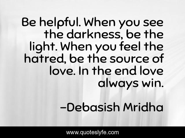 This page presents the quote "Be helpful. When you see the darkness, be the light. When you feel the hatred, be the source of love. In the end love always win.". Author of this quote is Debasish Mridha. This quote is about life, love, knowledge, inspirational, intelligence, philosophy, wisdom, quotes, affection,.