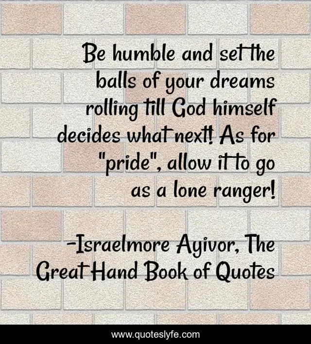 This page presents the quote "Be humble and set the balls of your dreams rolling till God himself decides what next! As for "pride", allow it to go as a lone ranger!". Author of this quote is Israelmore Ayivor, The Great Hand Book of Quotes. This quote is about humbleness, ball, dream-big, god, be-humble, proud, lone, lone-ranger, humble-yourself,.