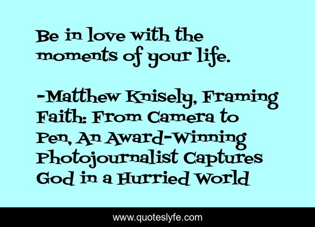 "Matthew Knisely, Framing Faith: From Camera to Pen, An Award-Winning Photojournalist Captures God in a Hurried World Quotes." Quoteslyfe.com, 2025. Fri. 05 Dec. 2025. <https://www.quoteslyfe.com/quote/Be-in-love-with-the-moments-of-238615>.