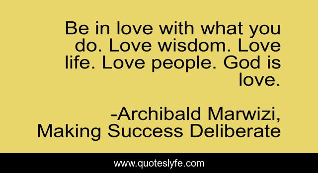 This page presents the quote "Be in love with what you do. Love wisdom. Love life. Love people. God is love.". Author of this quote is Archibald Marwizi, Making Success Deliberate. This quote is about life, success, behaviour, attitude, legacy, growth, purpose, inspirational, leadership,.