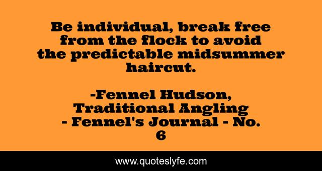 This page presents the quote "Be individual, break free from the flock to avoid the predictable midsummer haircut.". Author of this quote is Fennel Hudson, Traditional Angling - Fennel's Journal - No. 6. This quote is about different, character, individuality, individual, unique, maverick, identity, personality,.
