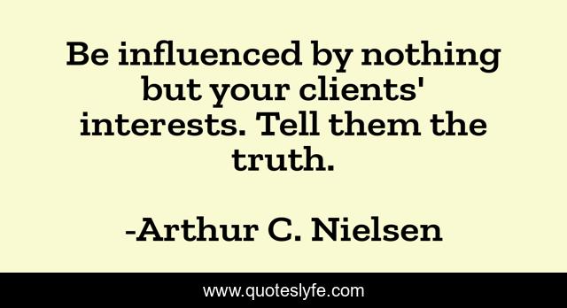 This page presents the quote "Be influenced by nothing but your clients' interests. Tell them the truth.". Author of this quote is Arthur C. Nielsen. This quote is about nothing, clients,.