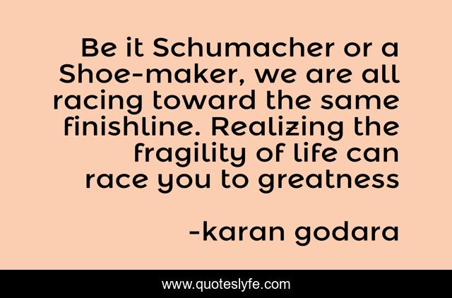 This page presents the quote "Be it Schumacher or a Shoe-maker, we are all racing toward the same finishline. Realizing the fragility of life can race you to greatness". Author of this quote is karan godara. This quote is about inspirational-attitude, inspirational-and-motivational, inspirational, enthusiasm,.