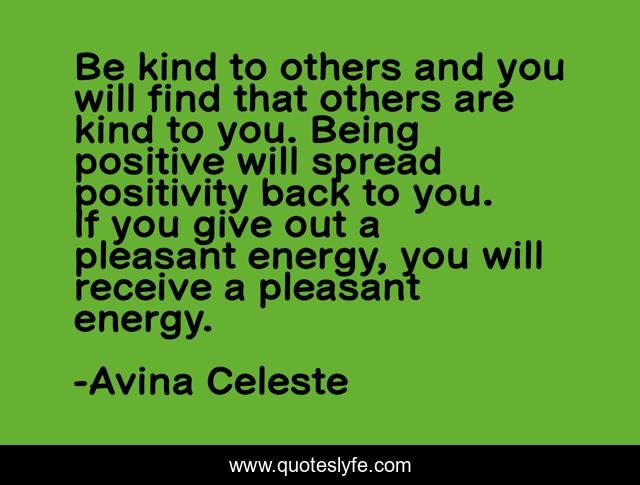 This page presents the quote "Be kind to others and you will find that others are kind to you. Being positive will spread positivity back to you. If you give out a pleasant energy, you will receive a pleasant energy.". Author of this quote is Avina Celeste. This quote is about confidence, positive, positivity, motivational, optimistic, inspirational, enthusiasm, kindness,.