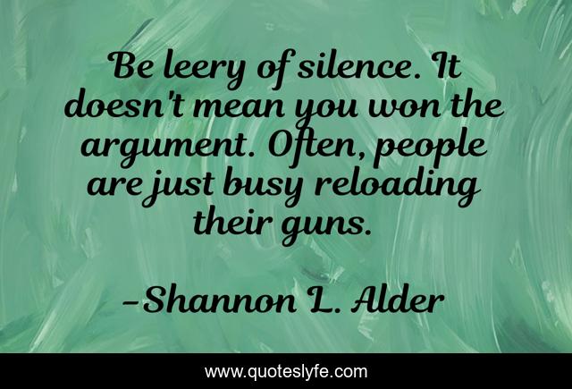 This page presents the quote "Be leery of silence. It doesn't mean you won the argument. Often, people are just busy reloading their guns.". Author of this quote is Shannon L. Alder. This quote is about hurting-me, ignoring, not-nice, playing-games, fake-christianity, deceitful, angry, cruetly, false-piety,.