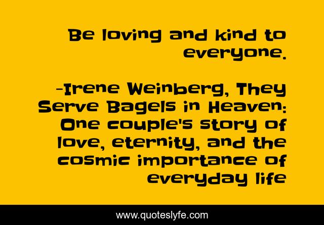 "Irene Weinberg, They Serve Bagels in Heaven: One couple's story of love, eternity, and the cosmic importance of everyday life Quotes." Quoteslyfe.com, 2025. Mon. 08 Dec. 2025. <https://www.quoteslyfe.com/quote/Be-loving-and-kind-to-everyone-172345>.