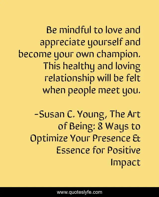 This page presents the quote "Be mindful to love and appreciate yourself and become your own champion. This healthy and loving relationship will be felt when people meet you.". Author of this quote is Susan C. Young, The Art of Being: 8 Ways to Optimize Your Presence & Essence for Positive Impact. This quote is about self-confidence, susan-young, relationship, communication-skills, passionate-living, communication, first-impressions, motivational-speaker, self-esteem,.