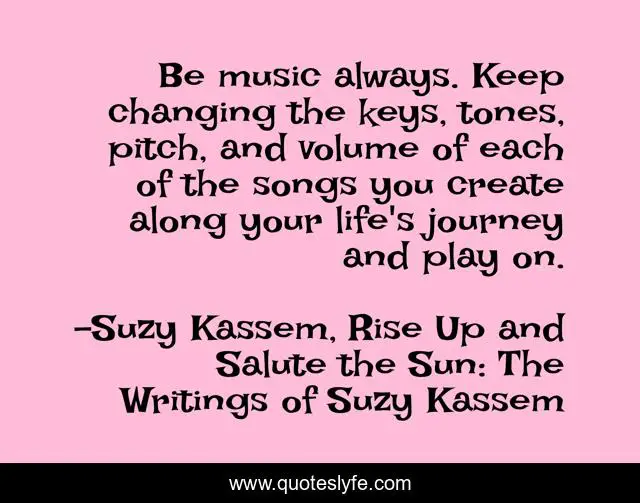 This page presents the quote "Be music always. Keep changing the keys, tones, pitch, and volume of each of the songs you create along your life's journey and play on.". Author of this quote is Suzy Kassem, Rise Up and Salute the Sun: The Writings of Suzy Kassem. This quote is about sound, living, life, transformations, song, keys, vibrant, notes, play,.