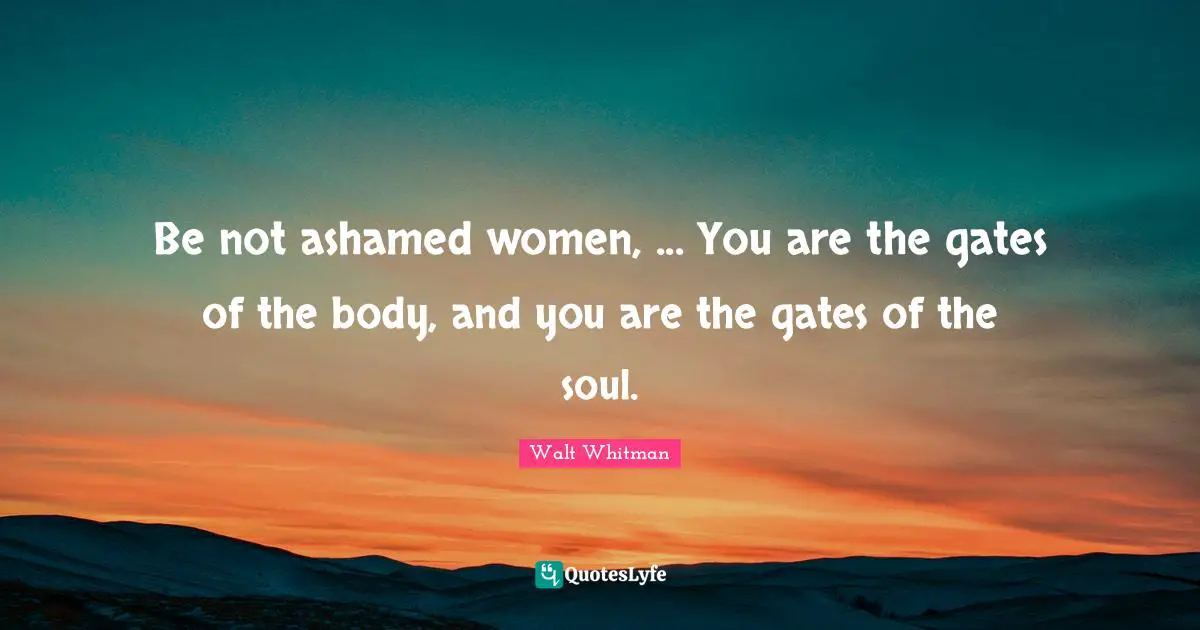 This page presents the quote "Be not ashamed women, ... You are the gates of the body, and you are the gates of the soul.". Author of this quote is Walt Whitman. This quote is about soul, gates, body, women, inspirational, being yourself, ashamed,.