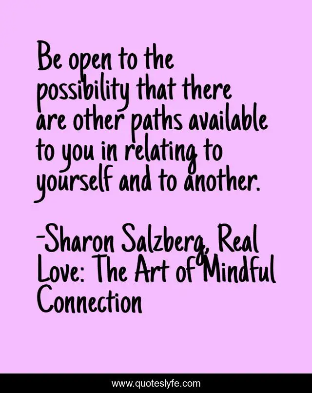 This page presents the quote "Be open to the possibility that there are other paths available to you in relating to yourself and to another.". Author of this quote is Sharon Salzberg, Real Love: The Art of Mindful Connection. This quote is about relationships, love, relationship, personal-growth, spiritual-path, real-love, affection,.
