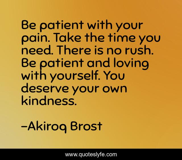 This page presents the quote "Be patient with your pain. Take the time you need. There is no rush. Be patient and loving with yourself. You deserve your own kindness.". Author of this quote is Akiroq Brost. This quote is about patience, kindness, pain,.