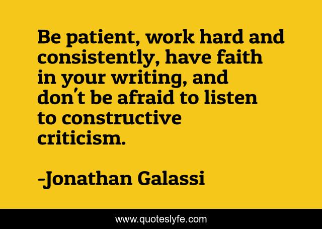 This page presents the quote "Be patient, work hard and consistently, have faith in your writing, and don't be afraid to listen to constructive criticism.". Author of this quote is Jonathan Galassi. This quote is about faith, work hard, writing,.