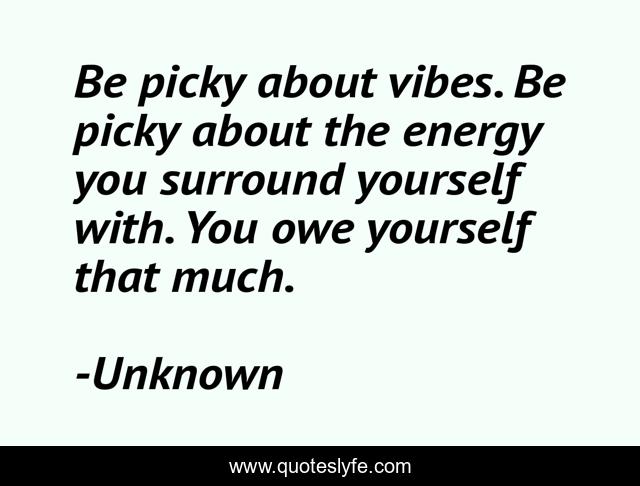 This page presents the quote "Be picky about vibes. Be picky about the energy you surround yourself with. You owe yourself that much.". Author of this quote is Unknown. This quote is about vibes, energy, friends, self-love, life,.