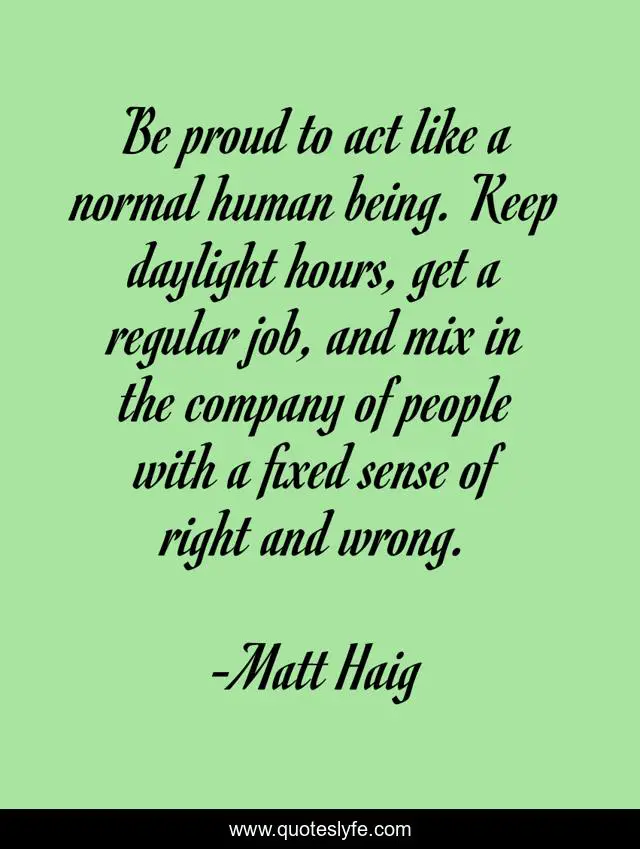 This page presents the quote "Be proud to act like a normal human being. Keep daylight hours, get a regular job, and mix in the company of people with a fixed sense of right and wrong.". Author of this quote is Matt Haig. This quote is about the-abstainer-s-handbook, vampires,.