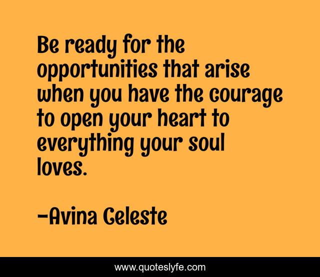 This page presents the quote "Be ready for the opportunities that arise when you have the courage to open your heart to everything your soul loves.". Author of this quote is Avina Celeste. This quote is about heart, confidence, positive, motivational, courage, optimistic, inspirational, enthusiasm, opportunity,.