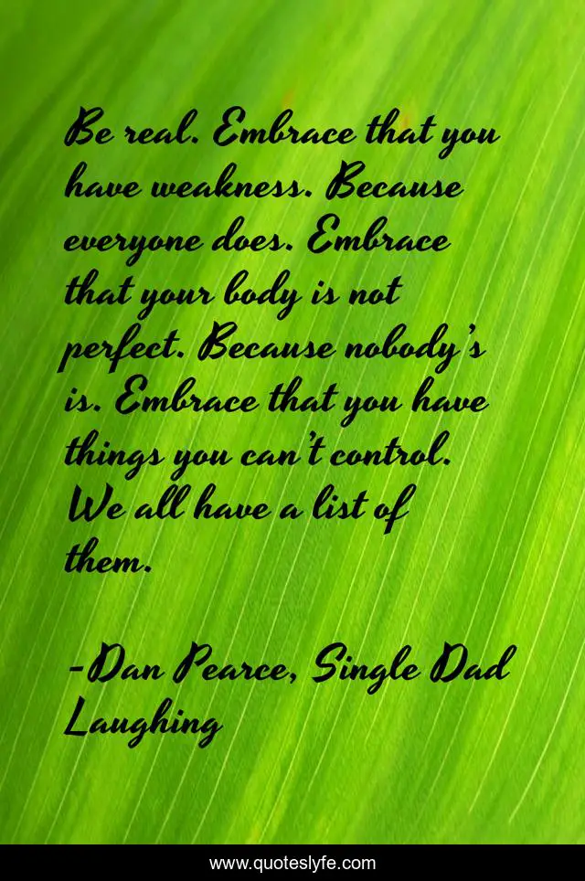 This page presents the quote "Be real. Embrace that you have weakness. Because everyone does. Embrace that your body is not perfect. Because nobody’s is. Embrace that you have things you can’t control. We all have a list of them.". Author of this quote is Dan Pearce, Single Dad Laughing. This quote is about self-awareness, pressure, self-realization, perfection, society-beauty, self-esteem,.