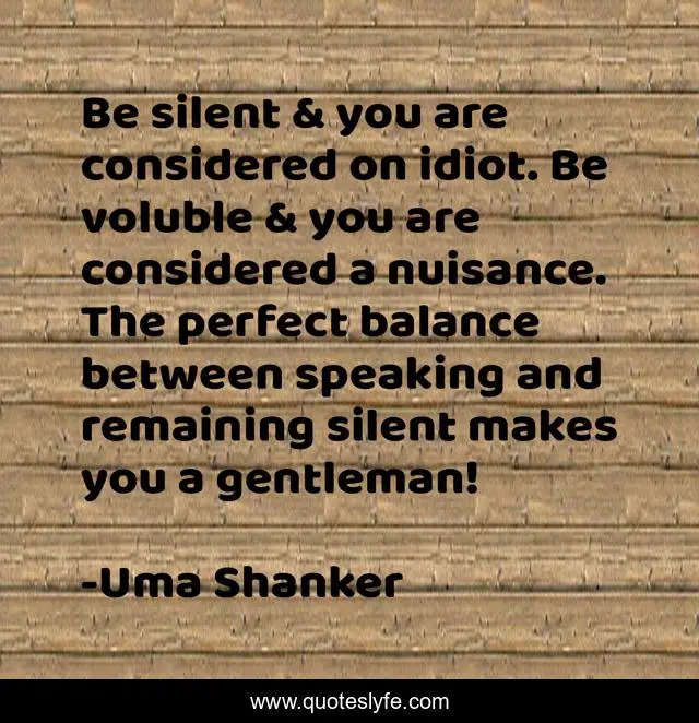 This page presents the quote "Be silent & you are considered on idiot. Be voluble & you are considered a nuisance. The perfect balance between speaking and remaining silent makes you a gentleman!". Author of this quote is Uma Shanker. This quote is about introvert, intellectual, speaking, life-lessons, foolish, silence,.