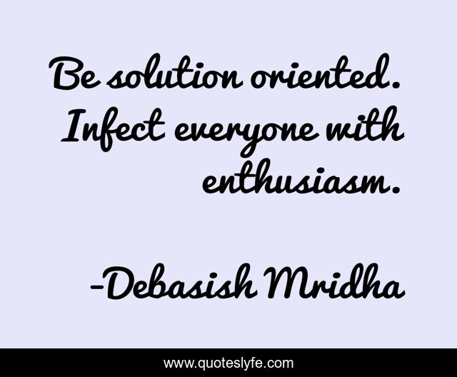 This page presents the quote "Be solution oriented. Infect everyone with enthusiasm.". Author of this quote is Debasish Mridha. This quote is about debasish, infect-everyone, mridha, philosophy, debasish-mridha, enthusiasm, problem-solving, solution-oriented,.