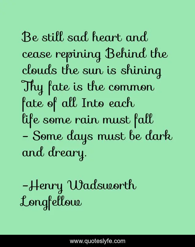This page presents the quote "Be still sad heart and cease repining Behind the clouds the sun is shining Thy fate is the common fate of all Into each life some rain must fall - Some days must be dark and dreary.". Author of this quote is Henry Wadsworth Longfellow. .