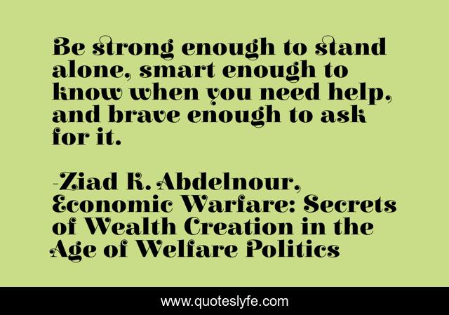 This page presents the quote "Be strong enough to stand alone, smart enough to know when you need help, and brave enough to ask for it.". Author of this quote is Ziad K. Abdelnour, Economic Warfare: Secrets of Wealth Creation in the Age of Welfare Politics. This quote is about brave, smart, strong,.