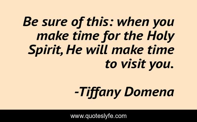 This page presents the quote "Be sure of this: when you make time for the Holy Spirit, He will make time to visit you.". Author of this quote is Tiffany Domena. This quote is about spiritual-growth, christian, spiritual-wisdom, prayer, spiritual-warfare, holy-spirit,.