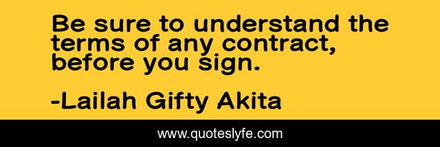 This page presents the quote "Be sure to understand the terms of any contract, before you sign.". Author of this quote is Lailah Gifty Akita. This quote is about terms, advice, contract, sign, understand, inspirational, enthusiasm, wisdom,.
