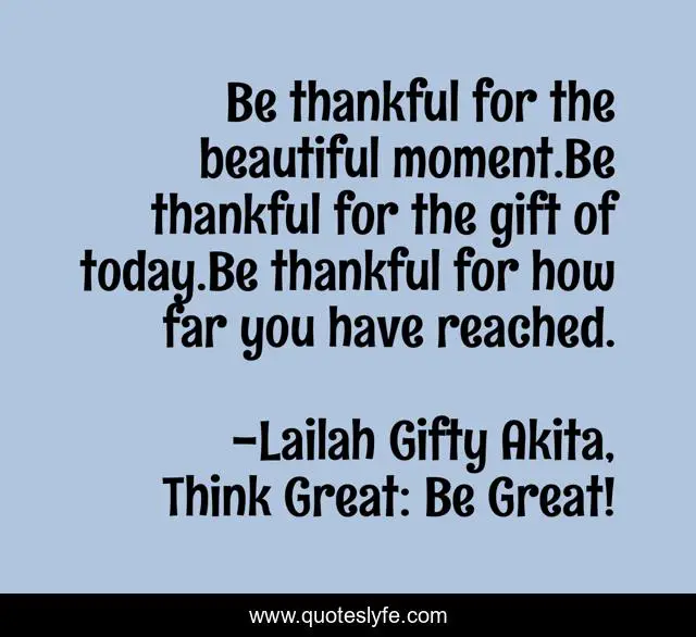 "Lailah Gifty Akita, Think Great: Be Great! Quotes." Quoteslyfe.com, 2025. Mon. 08 Dec. 2025. <https://www.quoteslyfe.com/quote/Be-thankful-for-the-beautiful-moment-Be-231647>.