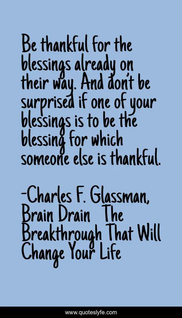 This page presents the quote "Be thankful for the blessings already on their way. And don’t be surprised if one of your blessings is to be the blessing for which someone else is thankful.". Author of this quote is Charles F. Glassman, Brain Drain The Breakthrough That Will Change Your Life. This quote is about gratitude, thankful, inspirational, enthusiasm,.