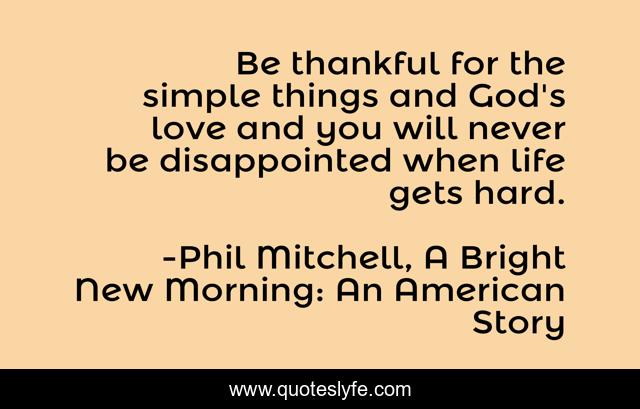 This page presents the quote "Be thankful for the simple things and God's love and you will never be disappointed when life gets hard.". Author of this quote is Phil Mitchell, A Bright New Morning: An American Story. This quote is about faith, simple-things-of-life, life-lessons, thankful,.
