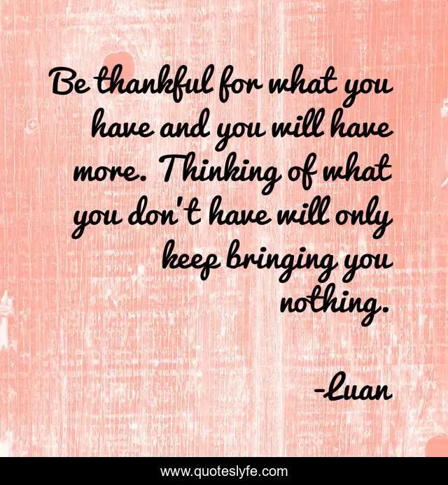 This page presents the quote "Be thankful for what you have and you will have more. Thinking of what you don’t have will only keep bringing you nothing.". Author of this quote is Luan. This quote is about enthusiasm, life, inspirational, reality,.