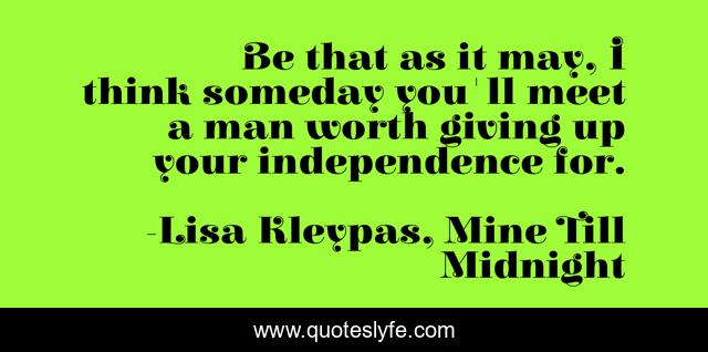 This page presents the quote "Be that as it may, I think someday you'll meet a man worth giving up your independence for.". Author of this quote is Lisa Kleypas, Mine Till Midnight. This quote is about hathaways, marriage, worth, independence, man,.